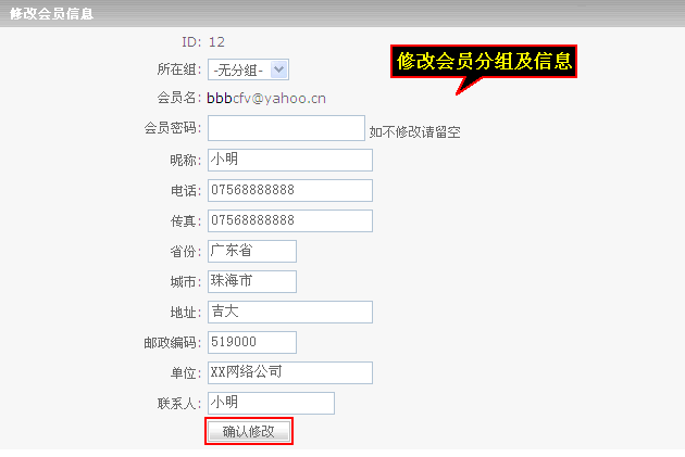 这里可以修改“会员分组”及“基本资料”,当会员密码忘记了,也可以在这里“更改会员密码”。